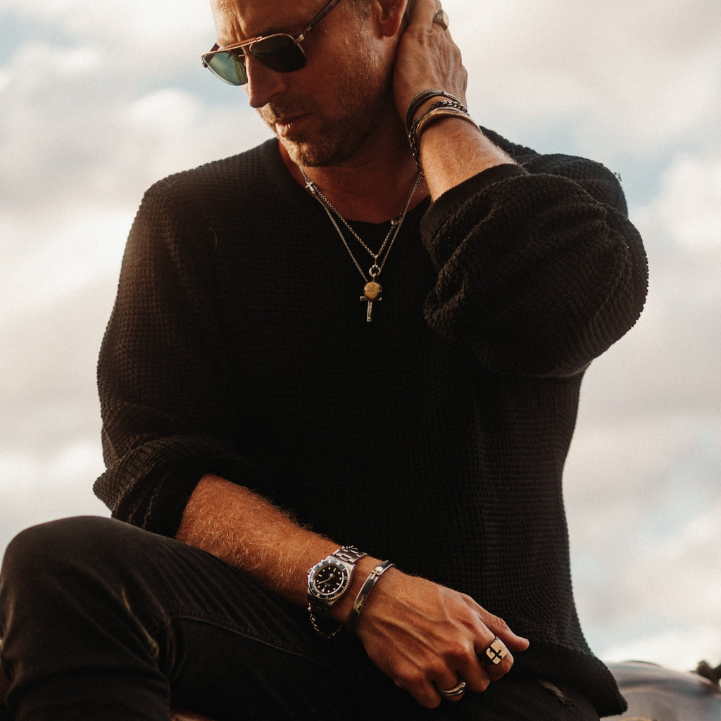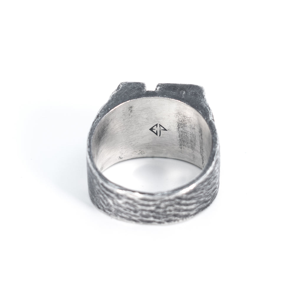 The new Cross Ring with Black Diamond is a solid piece, a larger-faced ring that is polished to give a mirror-like-finish, then hand etched into the ring is the classic cross, complete with black diamond. All sterling silver with oxidized sides and grooves for contrast and the rustic luxe aesthetic.