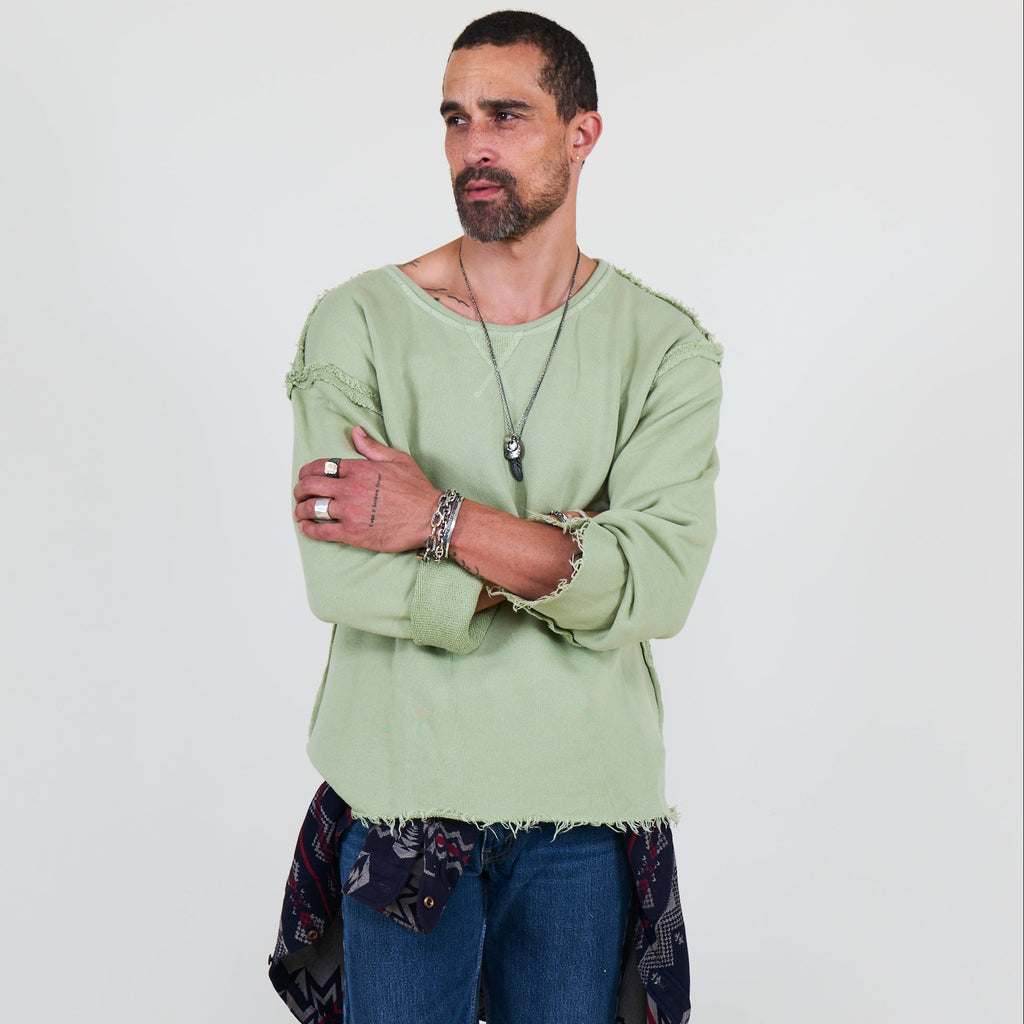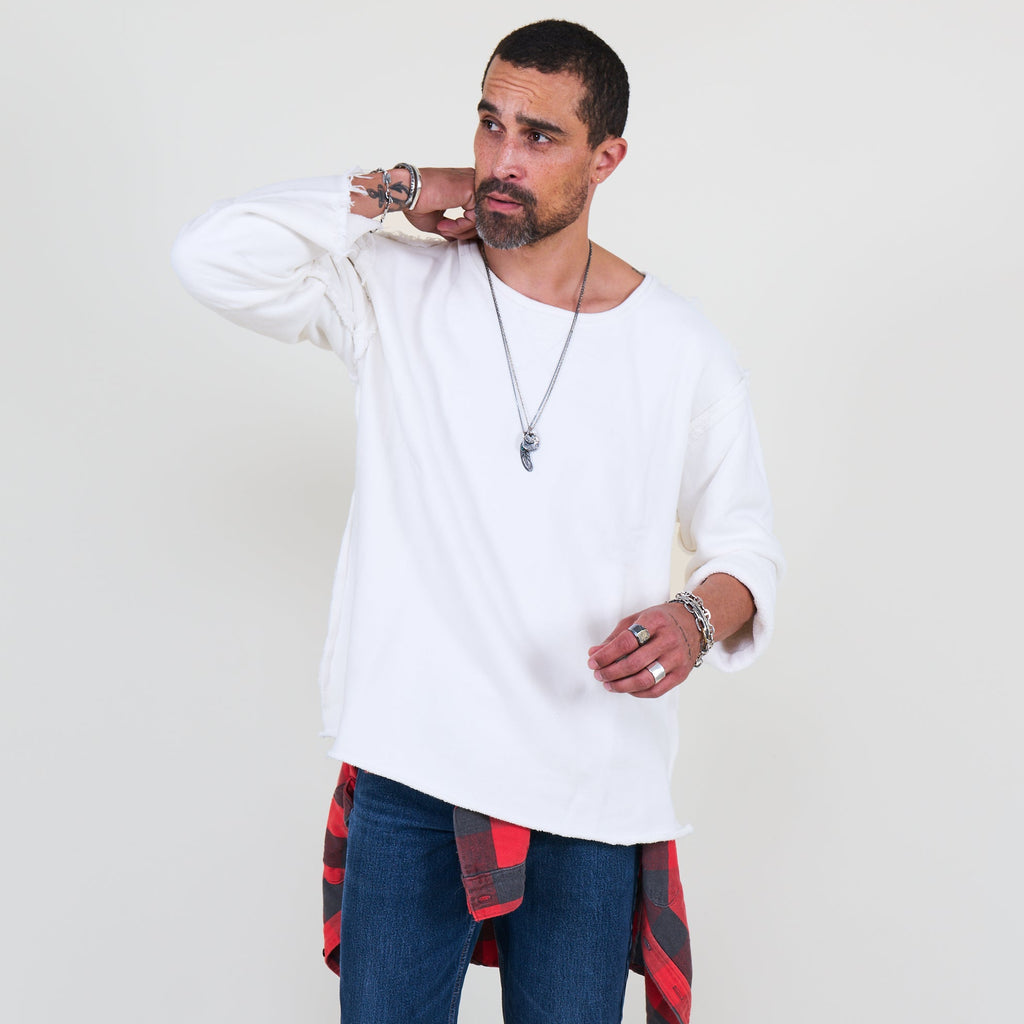 Model is wearing a Medium in the black Maverick sweater and Large in the White Maverick Sweater